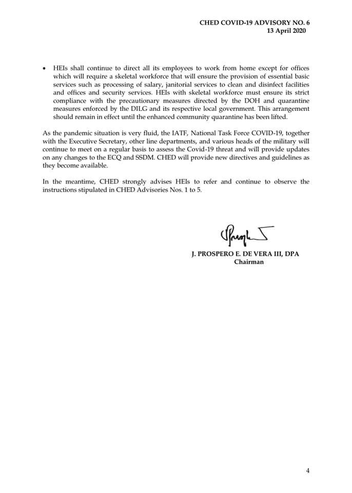 In connection with the Memorandum from the Executive Secretary dated 7 April 2020 which provides for the continuation of the enhanced community quarantine (ECQ) and the stringent social distancing measures (SSDM) to cover the entire Luzon until 30 April 2020, the Commission on Higher Education (CHED) hereby issues this advisory to all HEIs in the country. This advisory should be read in conjunction with the previously issued CHED Advisories on COVID-19 (Nos. 1-5).