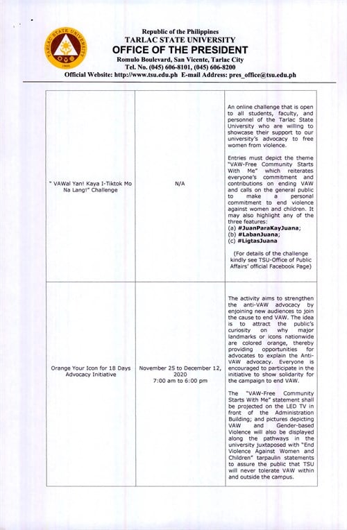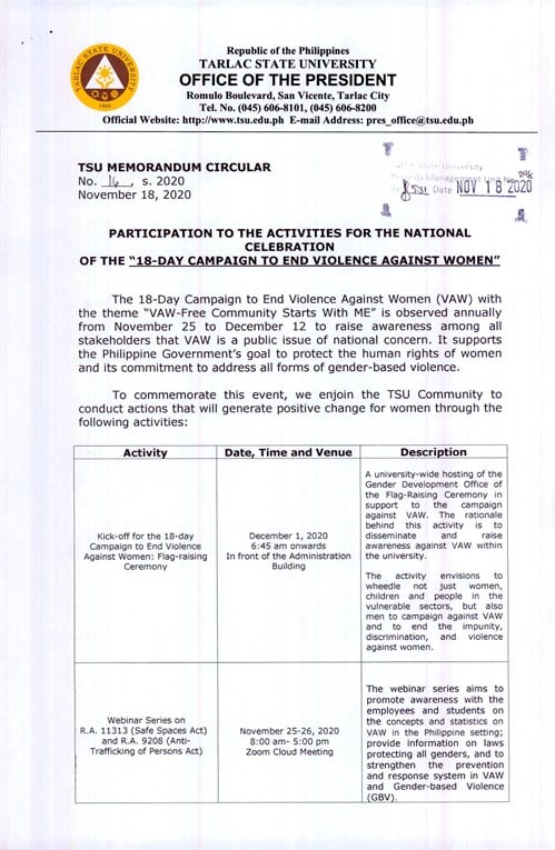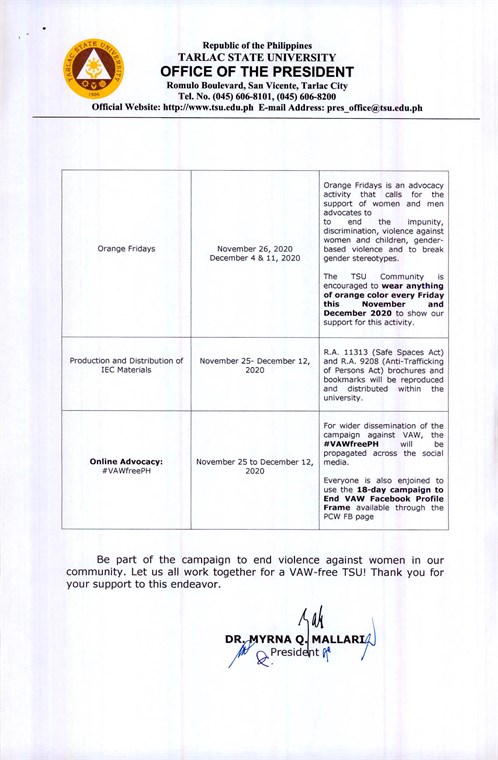 In line with this, the TSU Community is enjoined to participate with the activities prepared by the Gender and Development Office that will generate positive change for women.