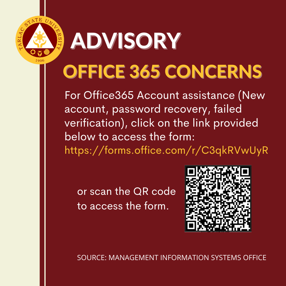 For Office365 Account assistance (New account, password recovery, failed verification), click on the link provided below or scan the QR code to access the form.