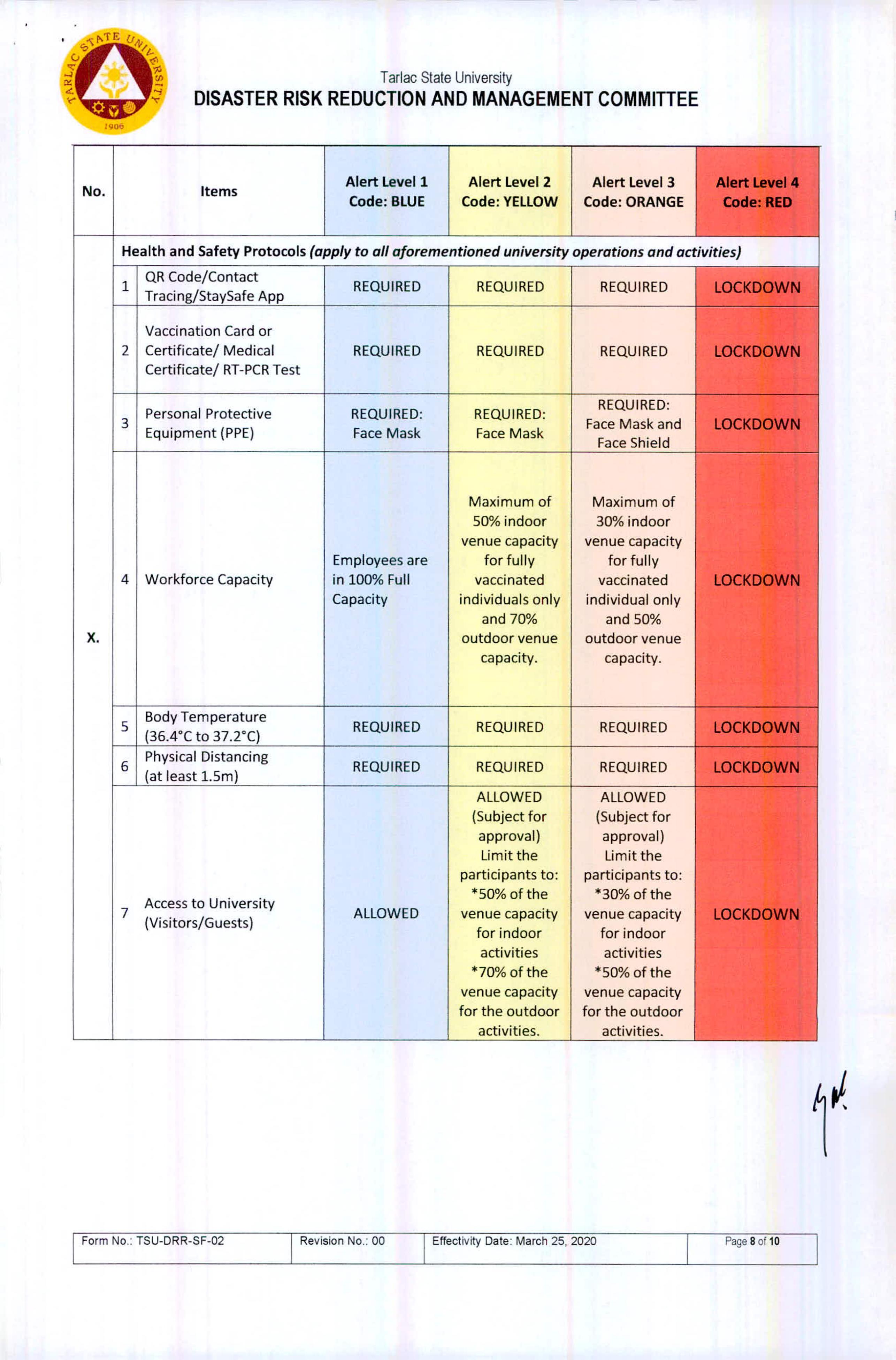 However, the offices concerned shall submit their specific guidelines and procedures for the conduct of their activities to the DRRMC (subject for approval) to facilitate efficient and safe delivery of services and proper dissemination of information.