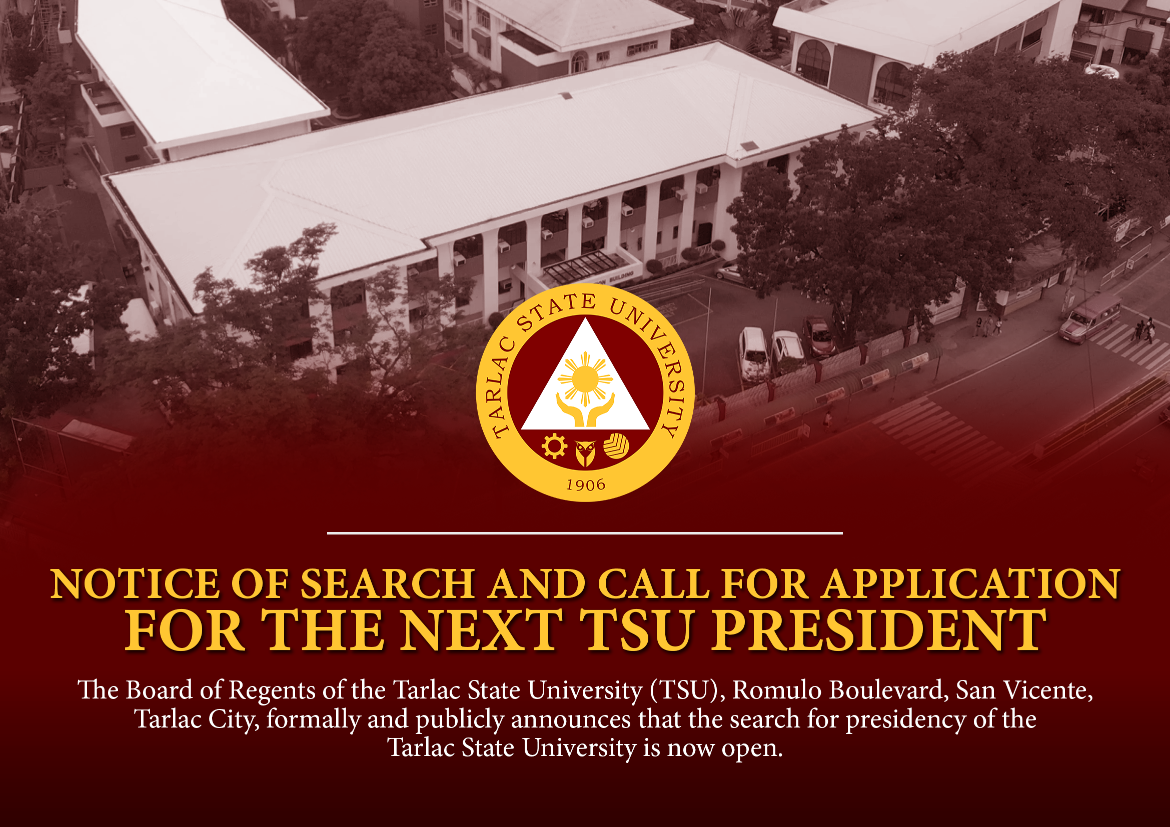 The Board of Regents of the Tarlac State University (TSU), Romulo Boulevard, San Vicente, Tarlac City, formally and publicly announces that the SEARCH FOR PRESIDENCY OF THE TARLAC STATE UNIVERSITY is NOW OPEN.