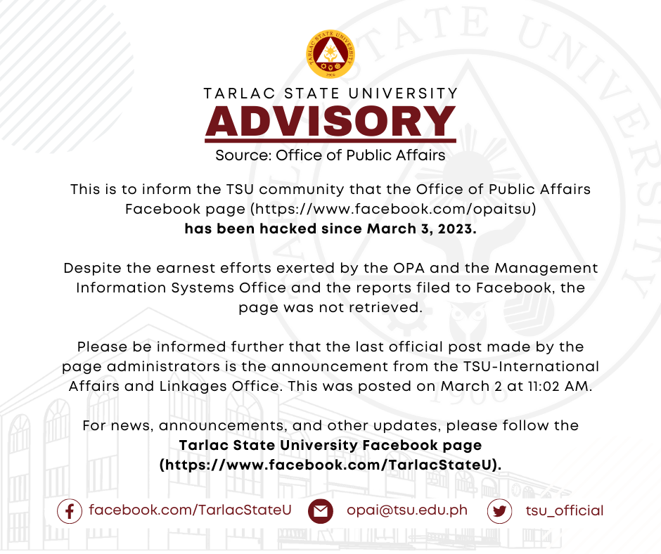 This is to inform the TSU community that the Office of Public Affairs Facebook page (https://www.facebook.com/opaitsu) has been hacked since March 3, 2023 (see: https://www.facebook.com/TarlacStateU/posts/pfbid02Hgqd5vDcmcbkiy38B8spdBDigcE2CQATovbejLvfvWavpwHPawqc6PYsRAZVAHpWl).