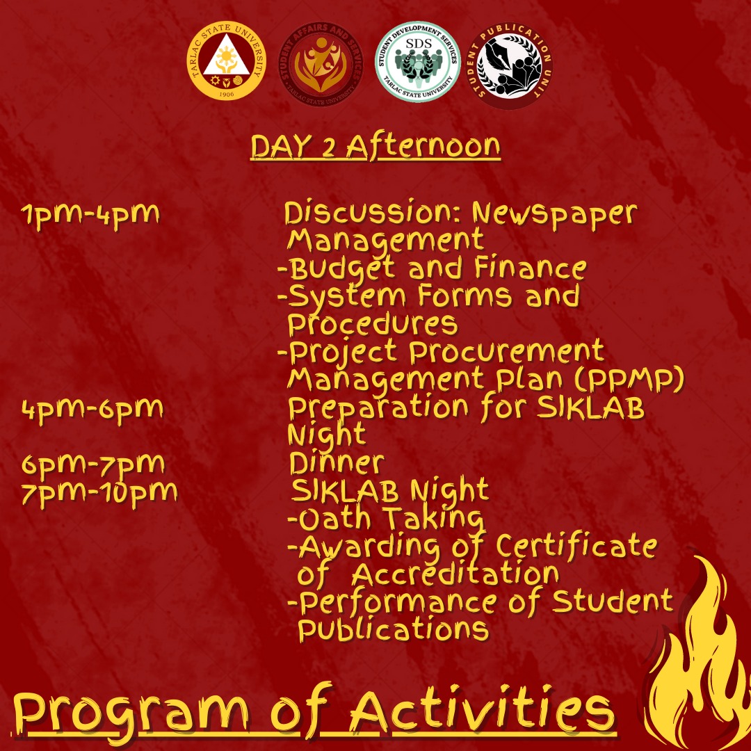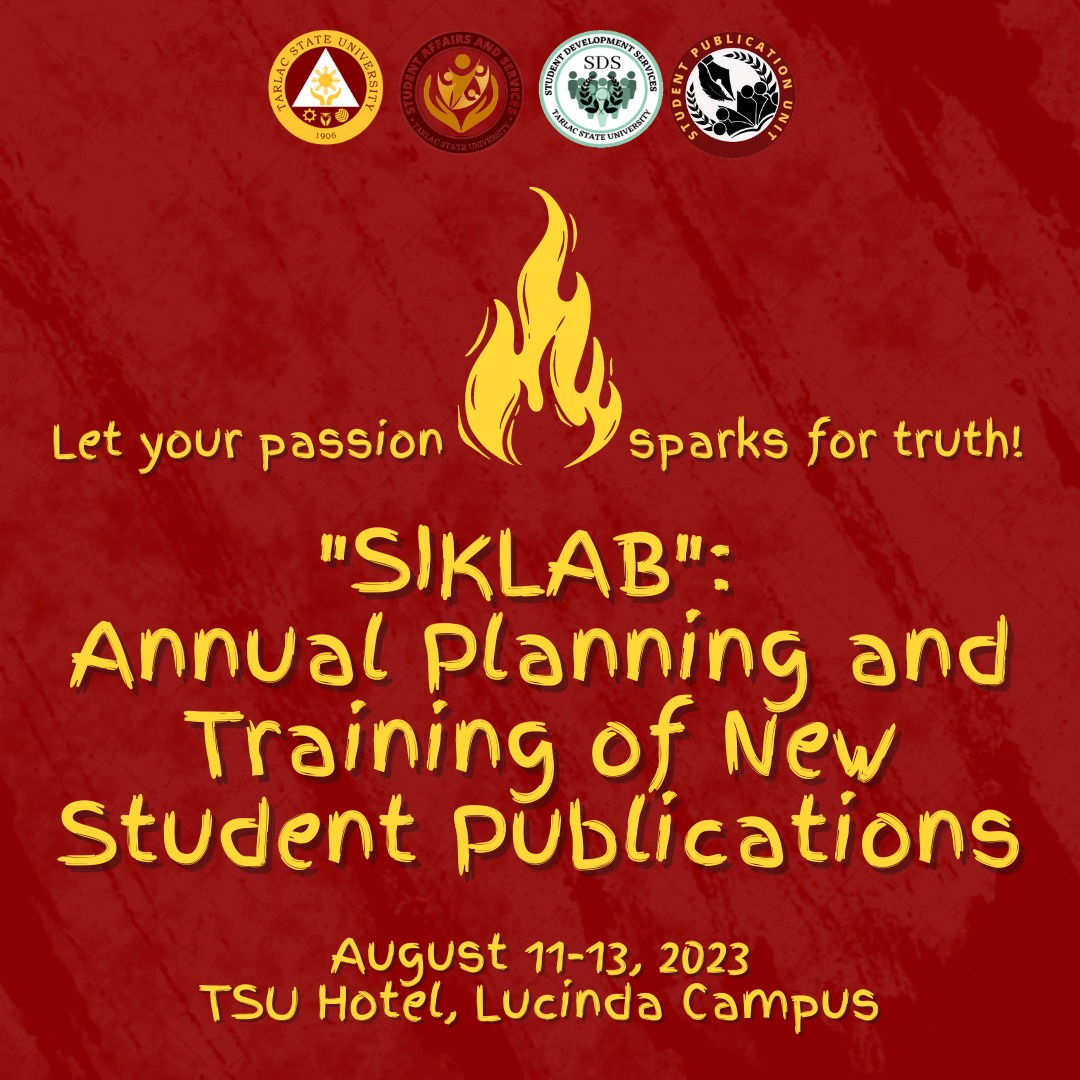To all the Student/College Publications in our university, the Tarlac State University - Student Publication Unit announces the conduct of the first-ever SIKLAB: Annual Planning and Training of New Student Publications in the university, on August 11-13, 2023, at the TSU Hotel, Lucinda Campus.