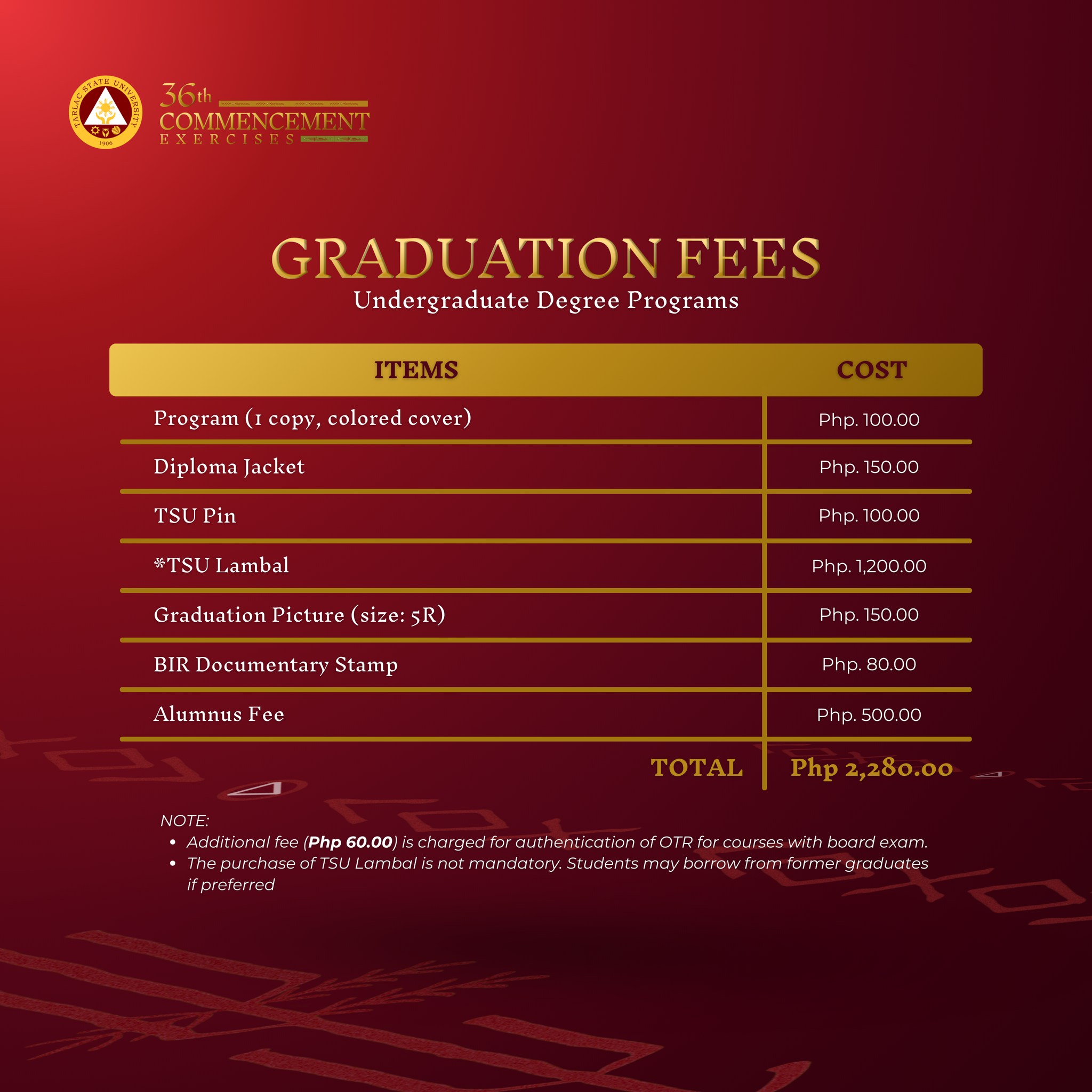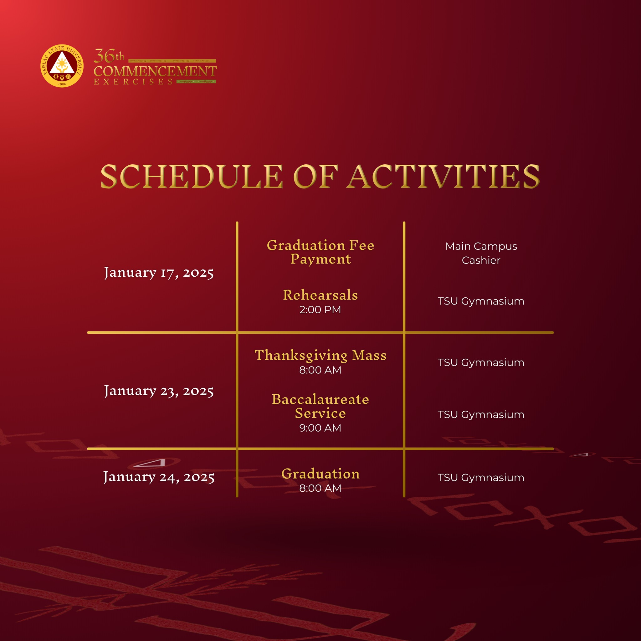 The activities and schedule for the 36th Commencement Exercises of Tarlac State University this January 24, 2025 is now available through TSU Memorandum Order No. 74, s. 2024.