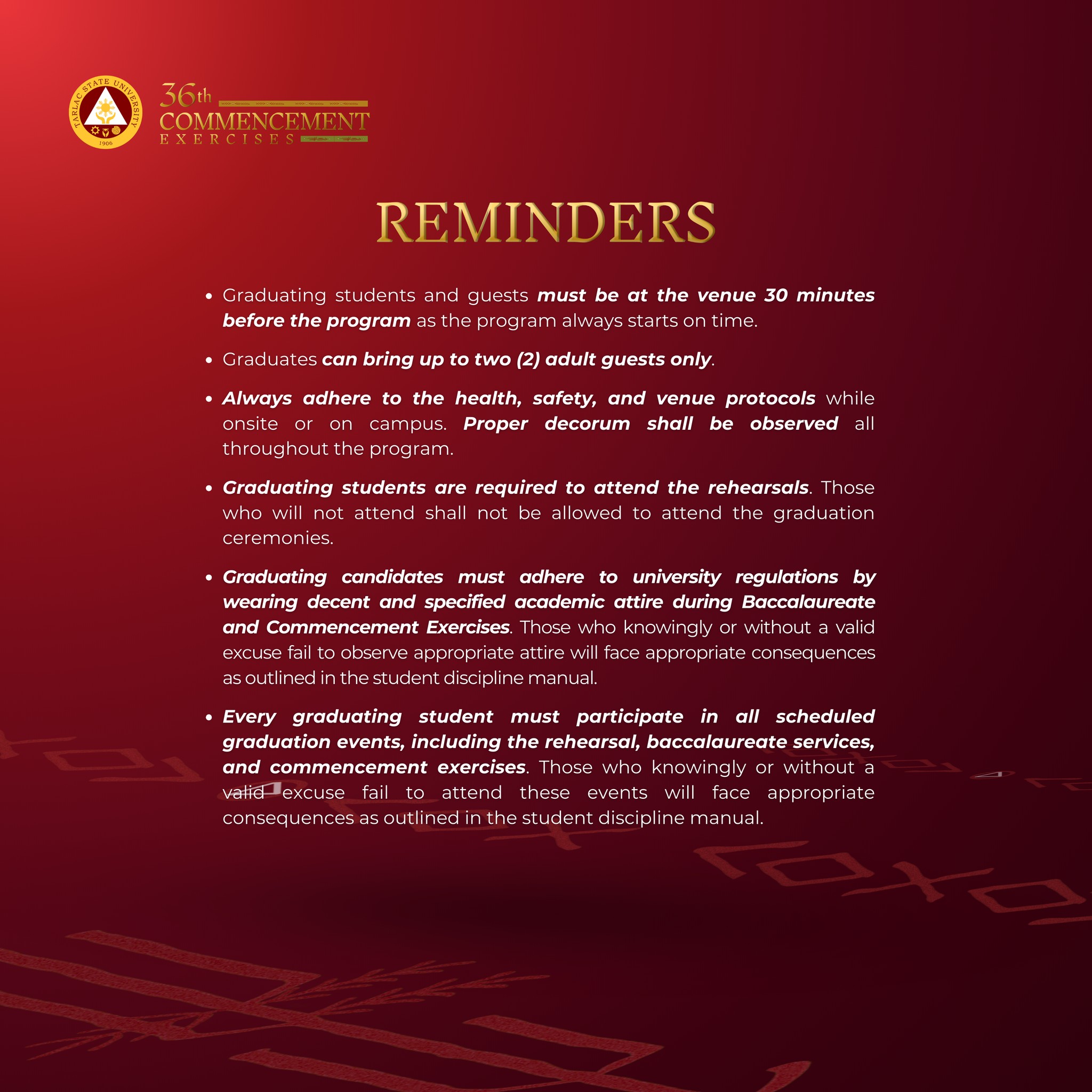 To all candidates for graduation, please be informed of the schedule of activities, graduation fee payment details, prescribed attire, and important reminders via the uploaded social media cards.