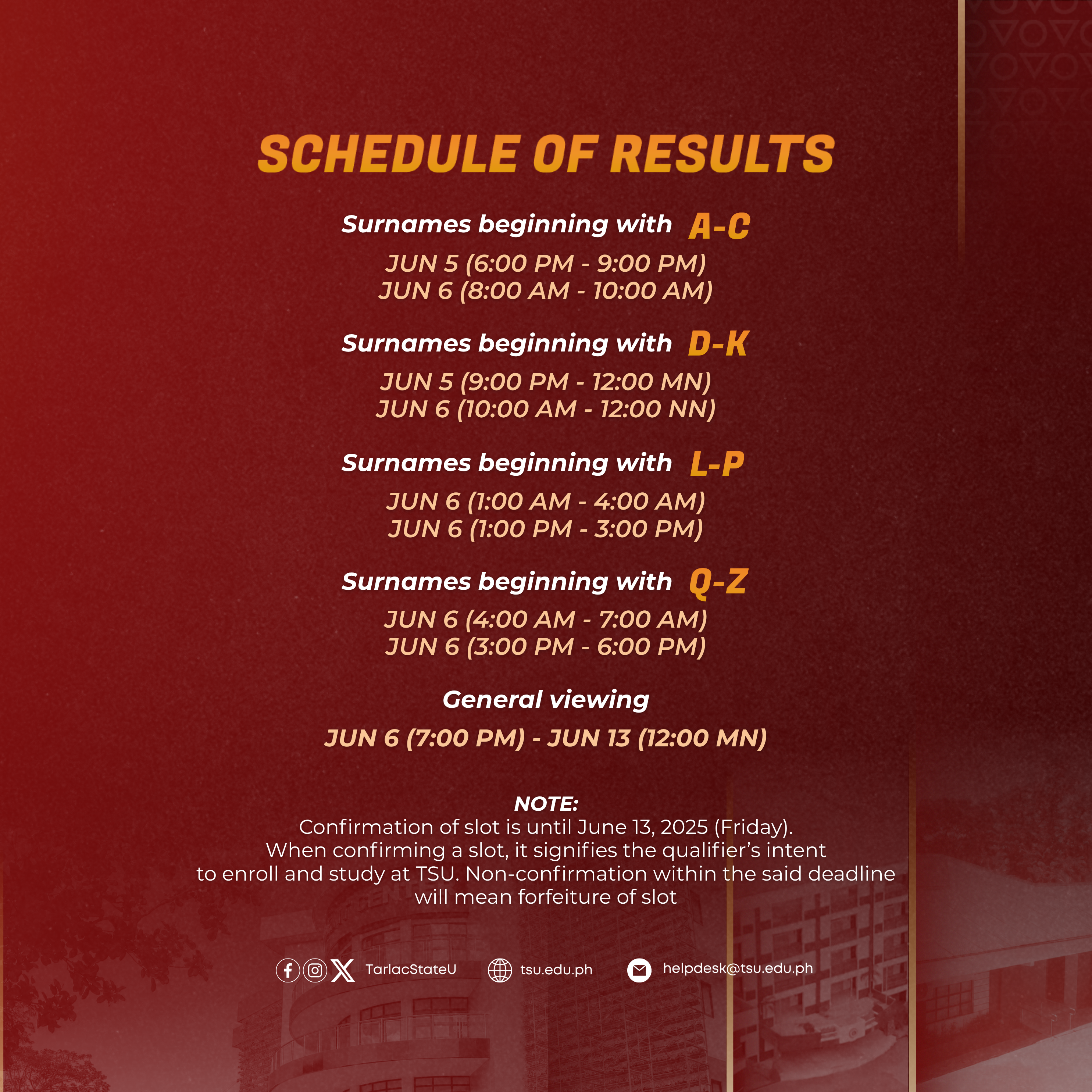 Applicants must follow their schedule (based on initial letter of surname) when viewing the results. Browse the uploaded social media card for details.