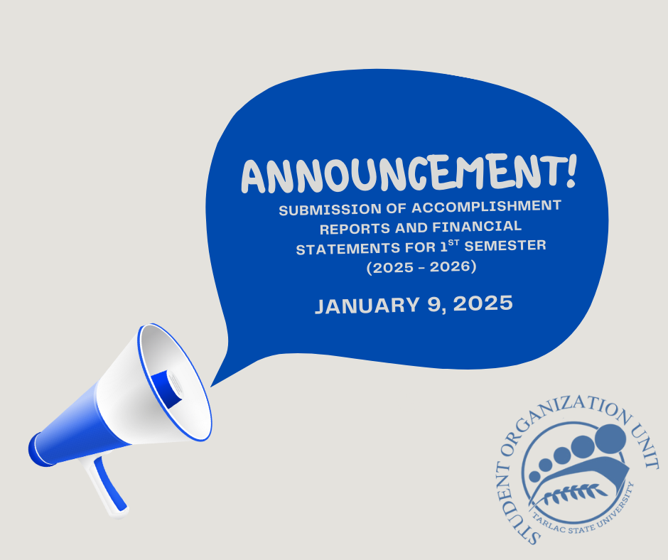 The Student Organizations Unit (SOU) would like to inform all recognized student organizations and student councils of Tarlac State University that the deadline of submission for the following documents will be on January 9, 2026: