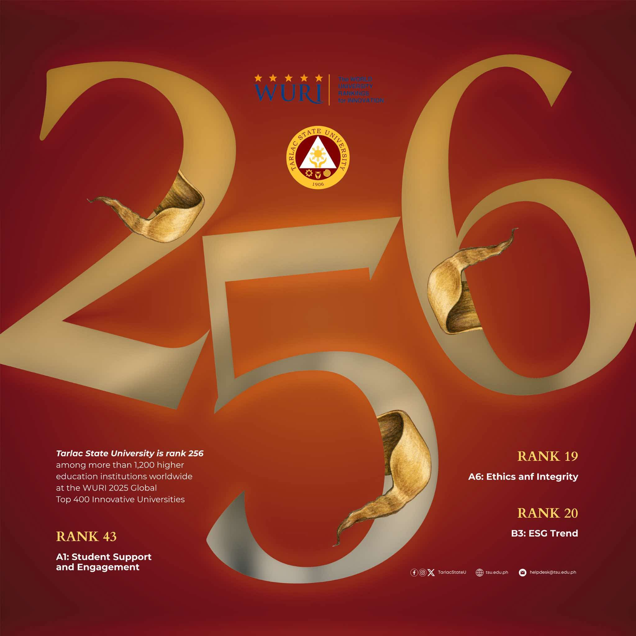 Tarlac State University stepped up in the overall ranking of the WURI 2025 Global Top 400 Innovative Universities, landing on the 256th spot out of more than 1,200 higher education institutions worldwide that submitted entries.