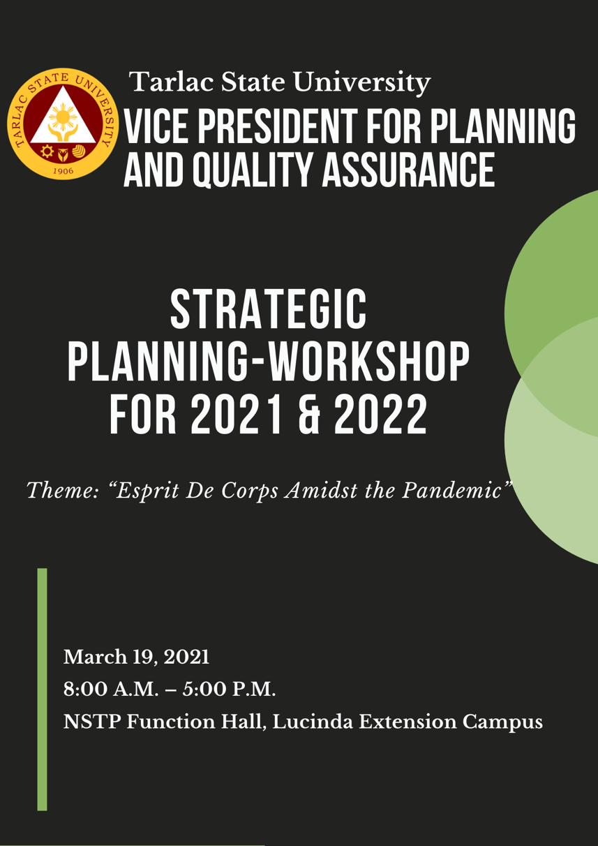 The Tarlac State University (TSU) Vice President for Planning and Quality Assurance office successfully conducted its Strategic Planning-Workshop for 2021-2022 at the NSTP Function Hall, Lucinda Extension Campus on March 19, 2021 with the theme, Esprit the Corps Amidst the Pandemic. Directors, unite heads and staff under the VPPPQAO attended the said event and shared their plans and targets for 2021-2022.